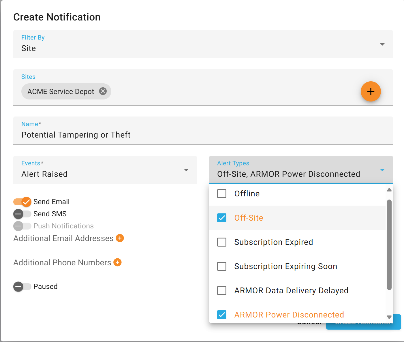 Stay informed about your assets by setting up notifications in ARMOR. You can create alerts for individual assets or groups of assets based on site or tag filters.